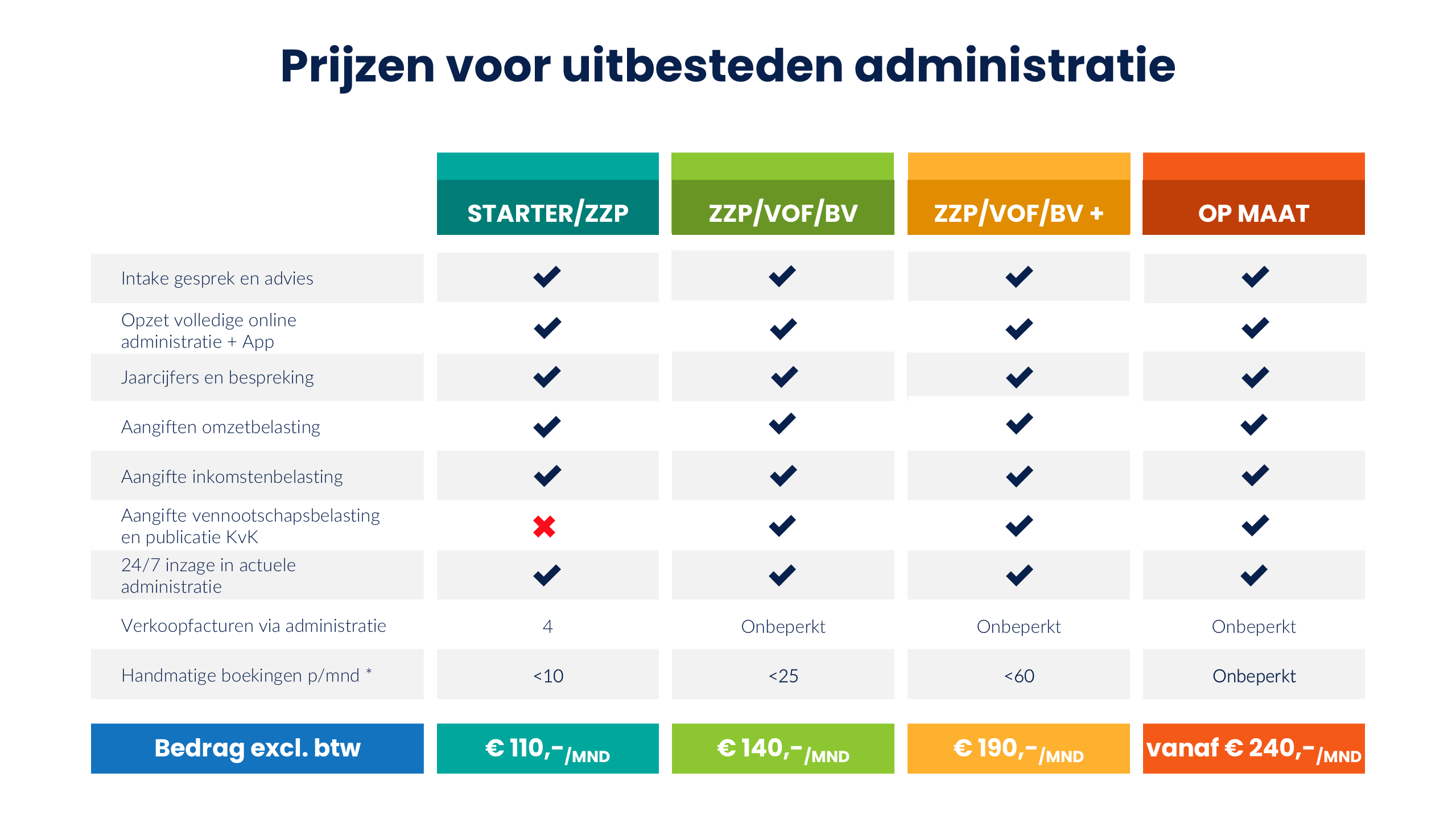 Voor de online-administratie werken we met vaste tarieven per maand en zorgen we dat de administratie actueel blijft. In de tarieven hebben we de belastingaangiften (Btw, IB en VPB) en de jaarrekening al verwerkt. Geen verrassingen dus!
